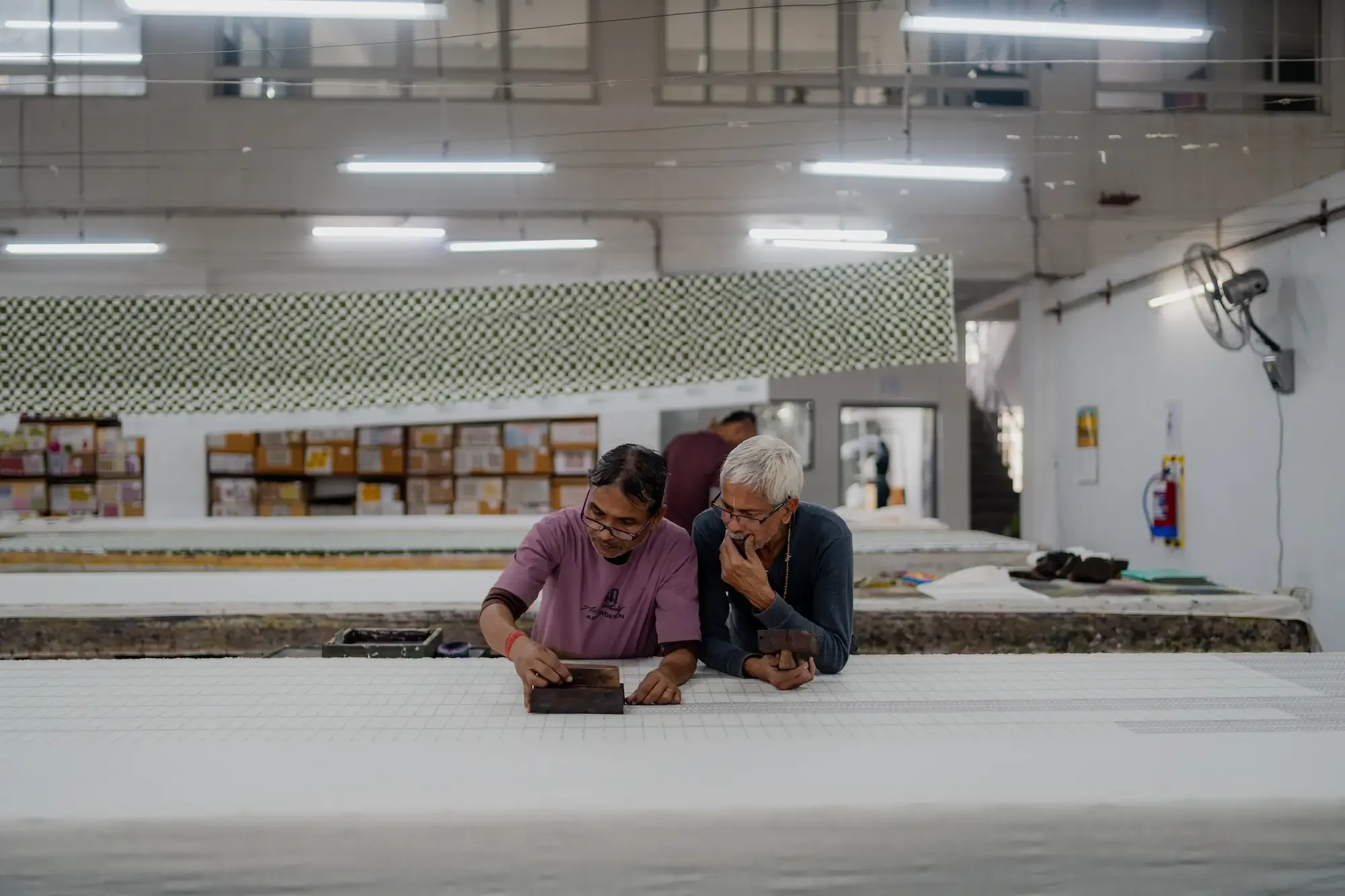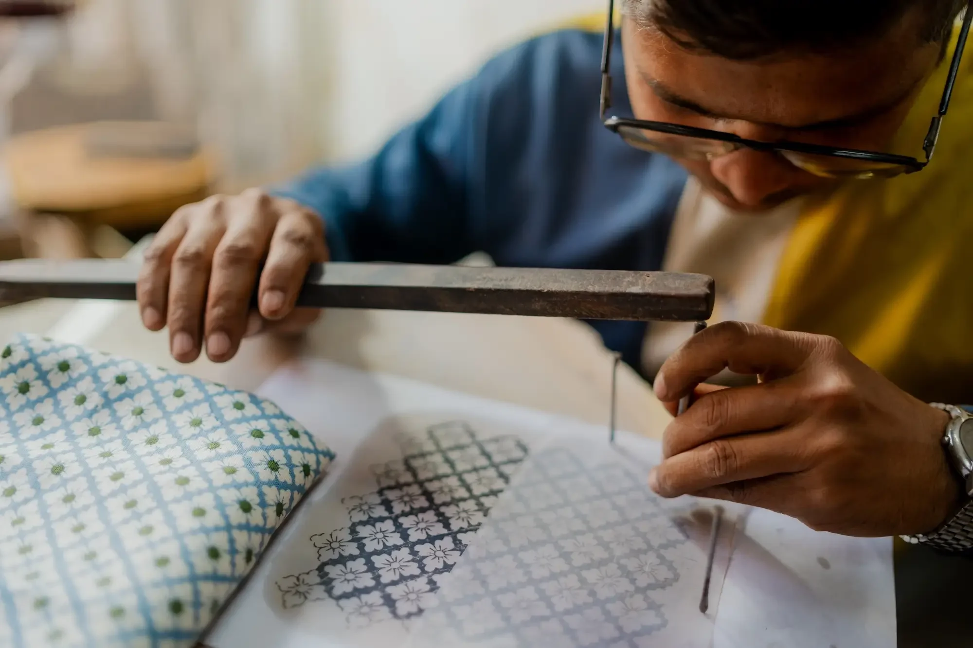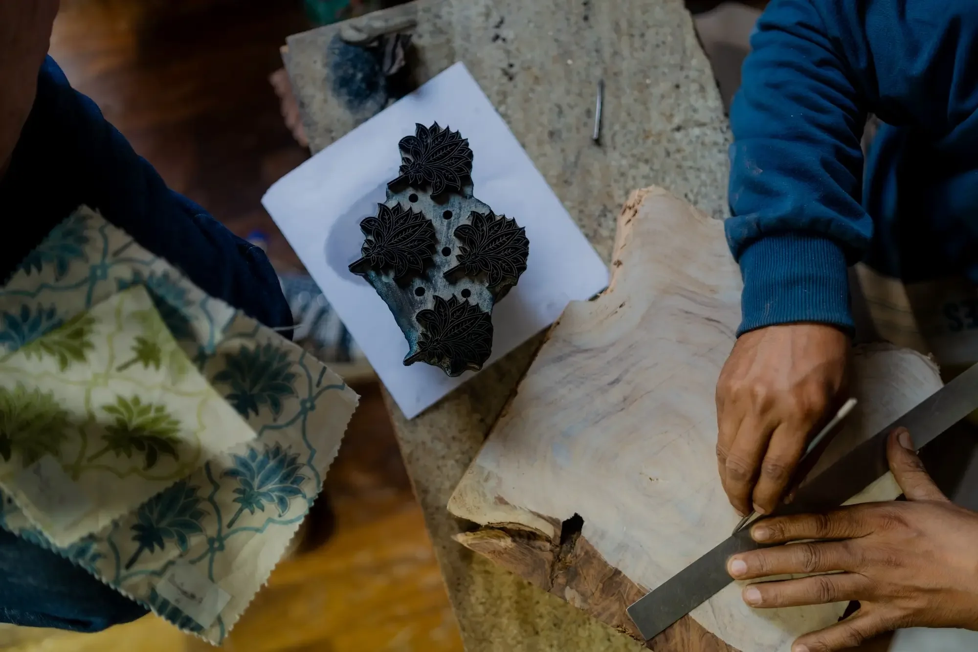 The sound of printing is mesmerising, as the rhythm of hands pressing down the block creates an audible and visible landscape while the patterns begin to take shape with colour. It is beautiful to witness the skill of the woodcarvers translating the design initially, which is then transferred onto the linen through the careful hands of the printers.