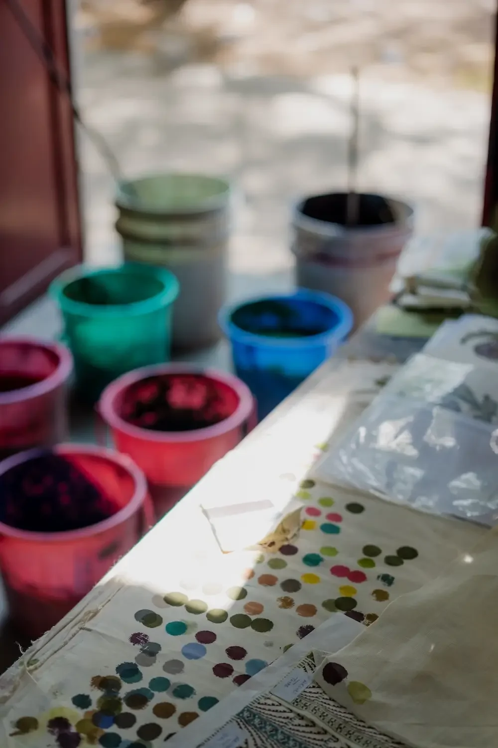 Our workshop uses minimum water and any used is recycled through the Common Effluent Treatment Plant which is part of the development. Water is used for making the colours and washing the colour buckets, blocks, and ink trays. Huge tanks are stored underground for rainwater harvesting during the Monsoon season. As previously mentioned, we use Archroma pigment inks and a binder which is made up of 80% water and 20% binder.