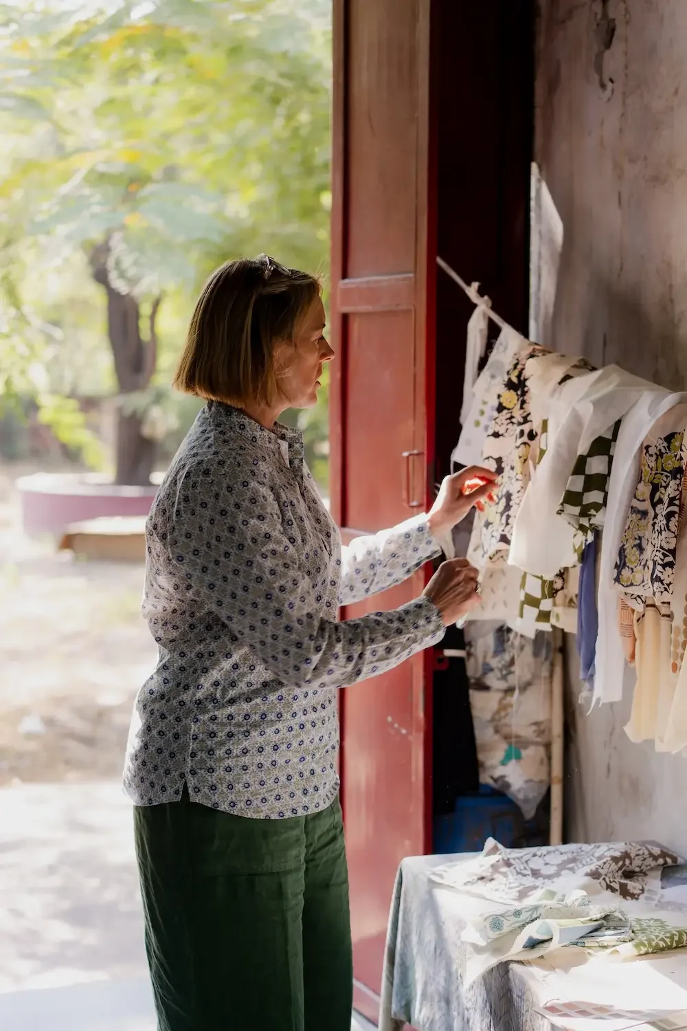 In the UK, our textile designer works remotely which, again, reduces the need for travel.The sound of printing is mesmerising, as the rhythm of hands pressing down the block creates an audible and visible landscape while the patterns begin to take shape with colour. It is beautiful to witness the skill of the woodcarvers translating the design initially, which is then transferred onto the linen through the careful hands of the printers.